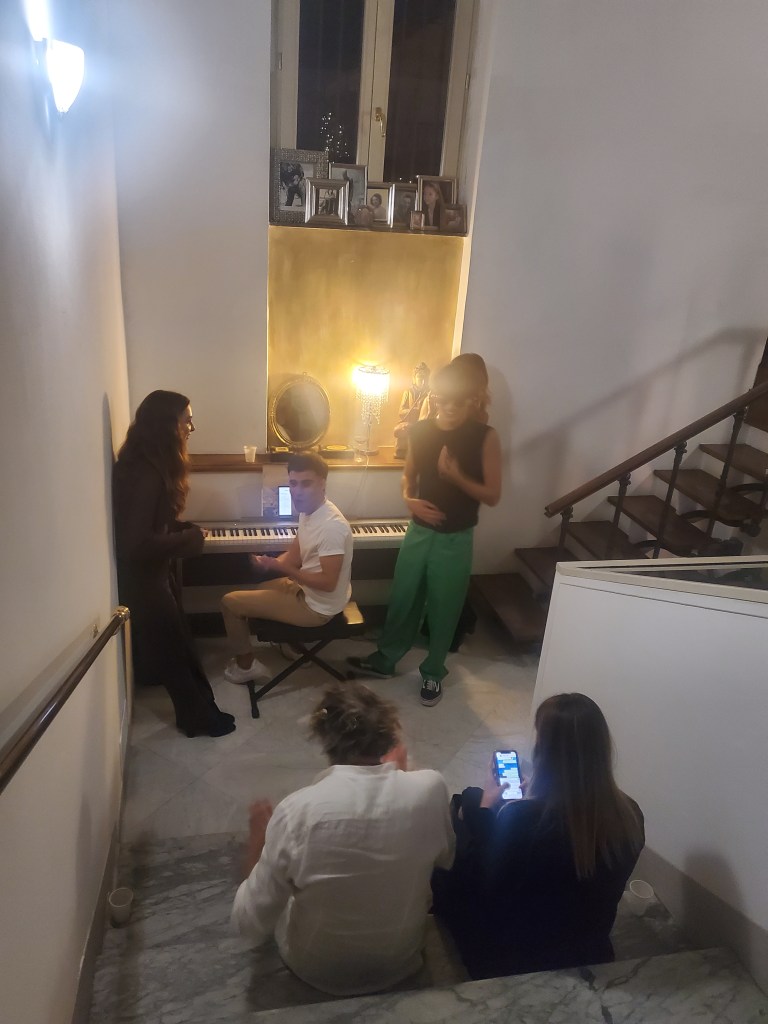 la scala interna dell’appartamento, con stucchi sulla volta del soffitto e un pianoforte tra i due piani, è perfetta per esporre opere d’arte, presentare libri e progetti, fare musica, degustando un buon bicchiere di vino e drinks , chiacchierando con gli amici. il doppio salone adiacente e la sala da pranzo con opere di arte contemporanea renderanno l’evento unico.